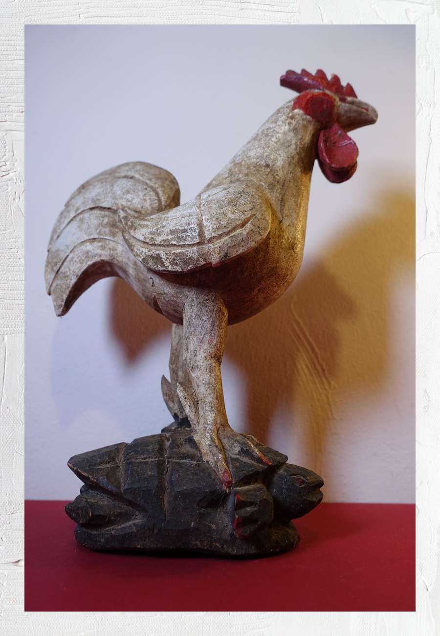 der Hahn handbemalt, Größe 28 cm. In ihren Anwesen gibt es nicht selten lebende Schildkröten als Zeichen für Fruchtbarkeit und Schutz. Die Ahnenverehrung ist ausgeprägt, einige Dörfer sind aus Lehm gebaut.