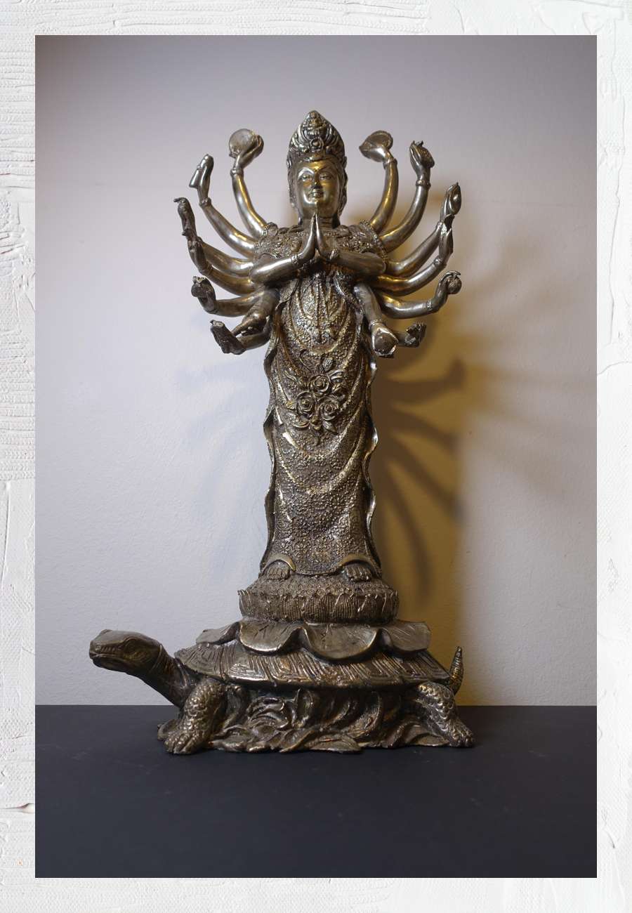 Kali (Sanskrit "Die Schwarze", Indien), hier 16-armig dargestellt, zum Teil auch 4- bzw. 8-armig, dies drückt ihre kosmischen Kräfte aus. Im Hinduismus Göttin des Todes und der Zerstörung, aber auch der Erneuerung, sie wird auch mit Shiva (s. dort) in Verbindung gebracht. Ikonographie und Mythologie variiren stark, in Nepal wird sie als göttliche Mutter verehrt. Messing, versilbert, Höhe 46 cm. Ein verwandtes Objekt gibt es aus Burma (Myanmar). Die indische Mythologie beruht weitgehend auf den Vorstellungen des Hinduismus, mit einer Vielzahl an Göttern (u.a. Brahma, Krishna, Vishnu, Ganesha) und Göttinnen (u.a. Sarasvati, Lakshmi, Parvati).