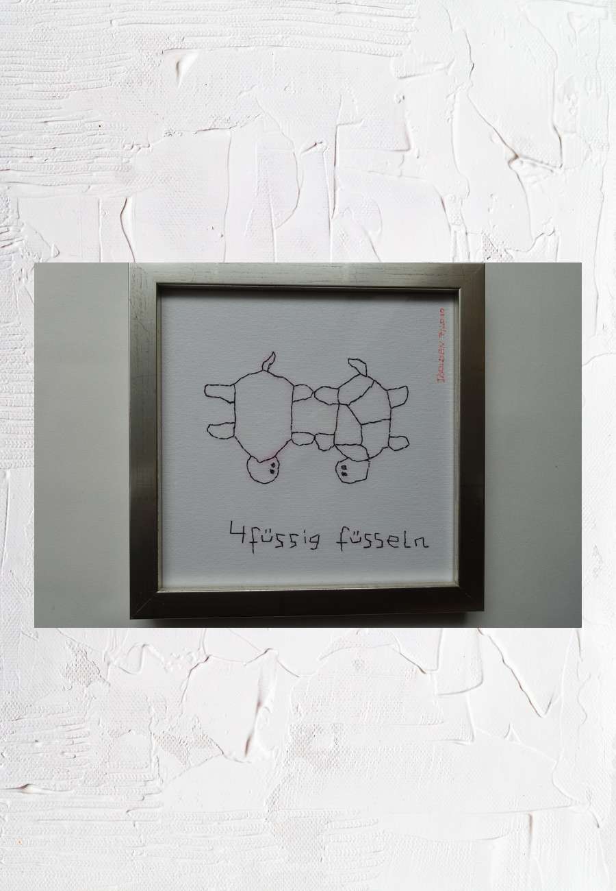 Auftragsarbeit (2010) an Isolden, witziges Motto "4füssig füsseln", sign., Format ca. 23 x 23 cm. Neu für die Sammlung war die Stick-Technik, das Panzermuster (rechts) wurde auf meinen Wunsch noch eingefügt. Dazu gibt es mehrere Bleistift-Zeichnungen.