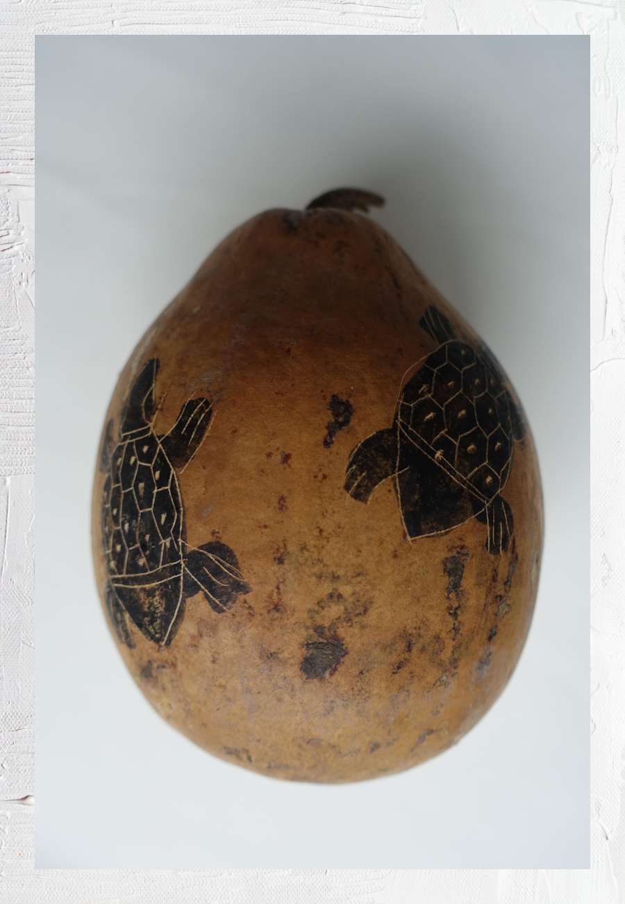 Kalebasse (Flaschenkürbis), naturbelassen, nur die insgesamt fünf Schildkrötenmotive sind leicht eingeritzt und gefärbt, Größe 15 cm.