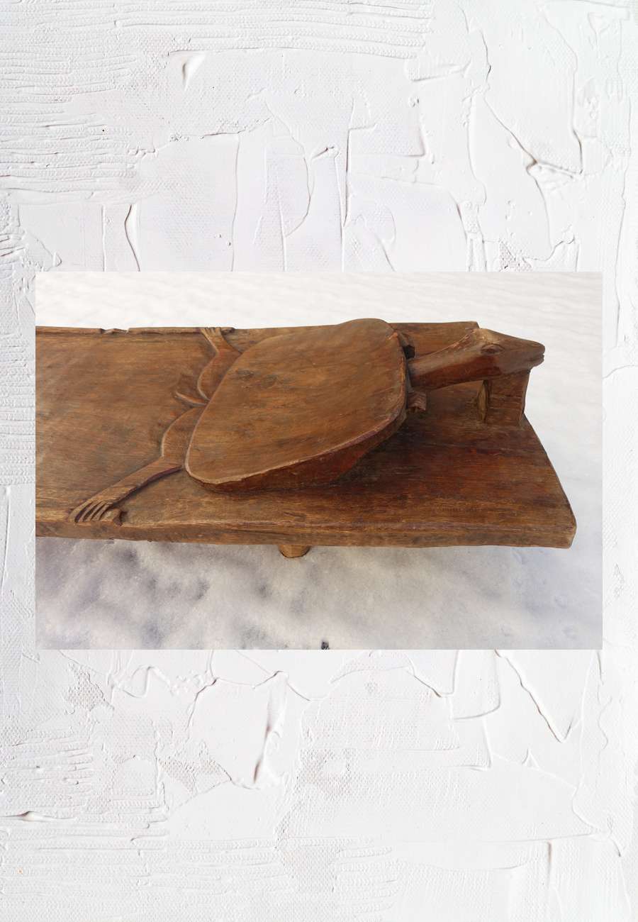 Diese alte Totenbahre (Ausschnitt) wird als Kafudalbett (auch Zeremonialbett oder funeral bed) bezeichnet und ist aus einem Stück aus dem Stamm eines tropischen Baumes herausgearbeitet, einschließlich der vier Beine. In der Ethnie der Senufo werden diese Bahren von der ganzen Dorfgemeinschaft genutzt, um Tote (in Tücher gewickelt) in einer Art Prozession zum Begräbnisplatz zu tragen, Größe170 cm. Der Ausschnitt wurde gewählt, damit die symbolträchtige Schildkröte deutlicher zur Geltung kommt. Ähnliche Objekte gibt es auch in benachbarten Volksgruppen, die Gestaltung der Kopfstütze ist jedoch