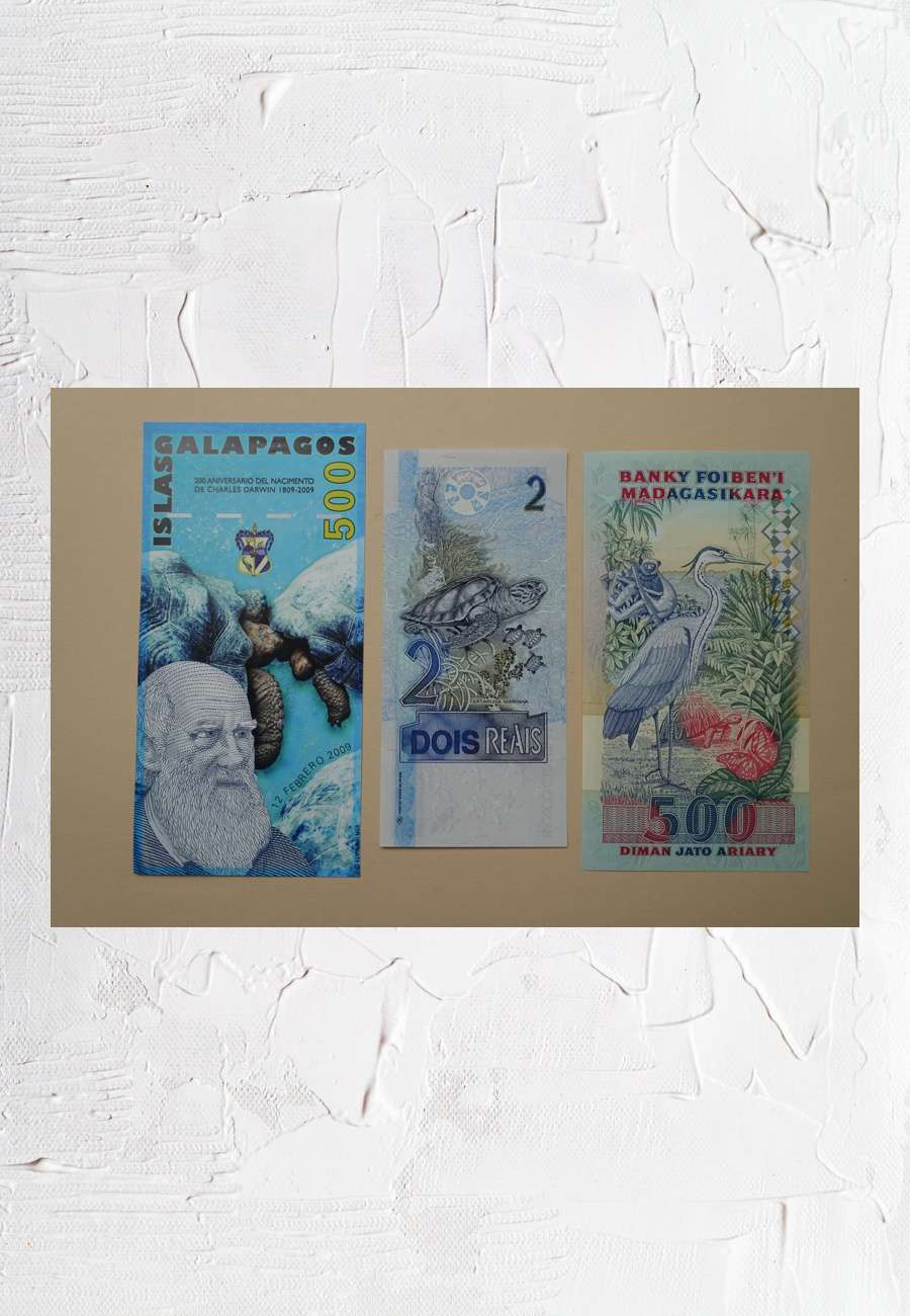 Die Banknote von Galapagos / Ecuador erinnert an den zweihundertsten Geburtstag von Charles Darwin (1809 - 1882). Dort begann die Entwicklung seiner Evolutionstheorie. Die endlosen Strände Brasiliens gaben Anlaß zu dem mittigen