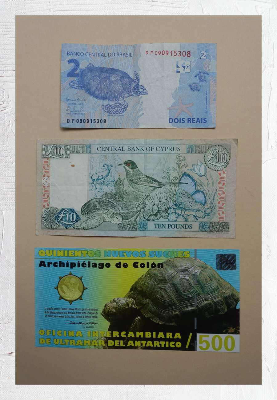 Es gibt eine weitere Banknote mit Meeresschildkröten aus Brasilien. Auf dem Geldschein von Zypern sind dort beliebte Tiere und Pflanzen zu sehen und der