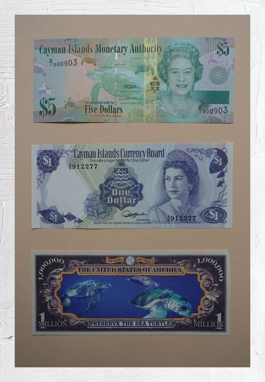 Die Cayman Islands mit dem Porträt der Queen gehören zu Großbritannien. Bei genauem hinsehen kann man an die zehn Schildkröten erkennen.