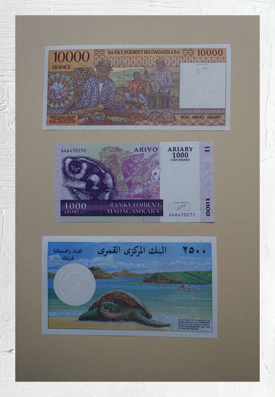 Diese Banknote von Madagaskar zeigt u.a. 3 Handwerker und 2 heimische Strahlenschildkröten (auch als Sternschildkröten bezeichnet). Auf dem nächsten Geldschein dieser Insel sind Kattas (Halbaffen aus der Gruppe der Lemuren) und eine inzwischen stark gefährdete Schnabelbrustschildkröte ( endemische Art, äußerst selten) zu sehen. Unten: Geld der Comoren-Inseln (östlich von