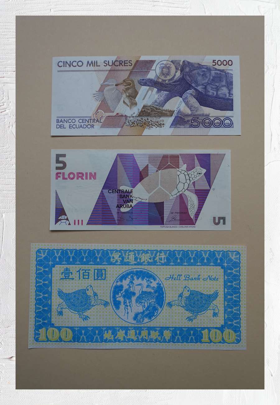 korrekt mit Chelonia Mydas bezeichnet (Trivialname Suppenschildkröte). Die "Hell Bank Note" ist kein gültiges Währungsmittel und kommt aus China. Auf