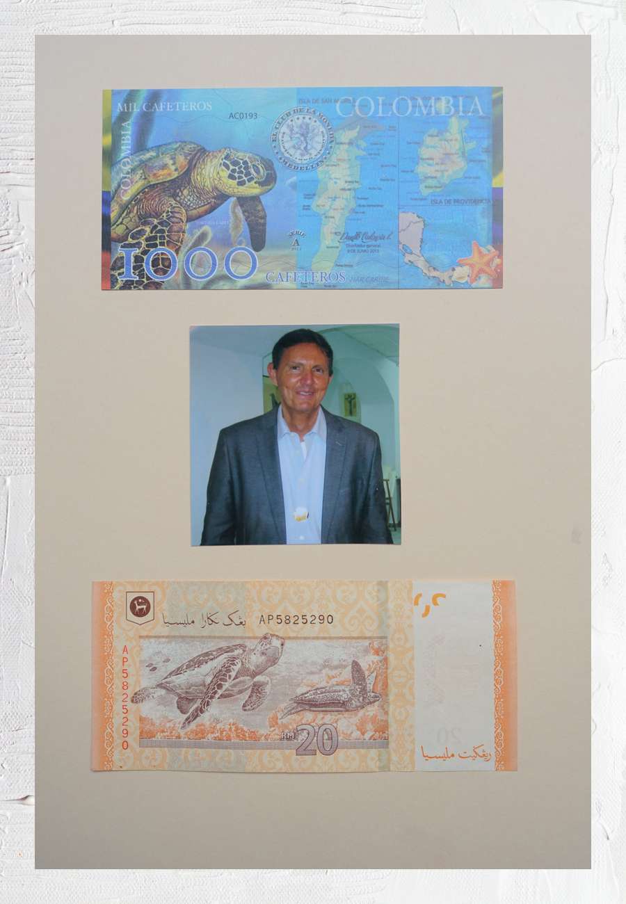 Geldschein aus Kolumbien, mit der Abbildung von Inseln, auf denen die große Meeresschildkröte beheimatet ist (1.000 Pesos entsprechen ca. 0,23 €). Die Sicherheitselemente sind hier bescheiden.