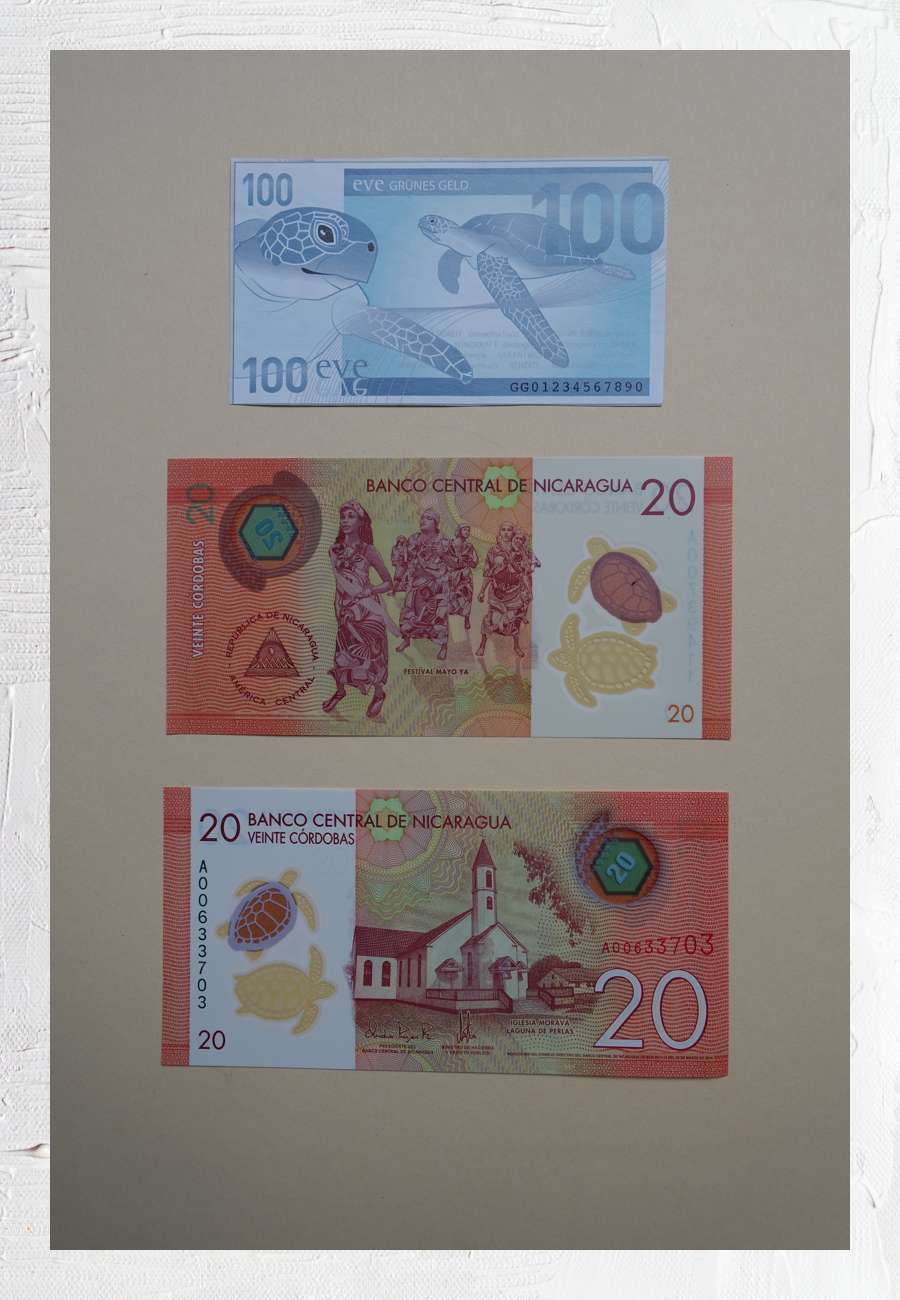 Die Banknote von Nicaragua ist innovativ gestaltet. Die Meeresschildkröten sind transparent eingearbeitet und deshalb von beiden Seiten gleichermaßen