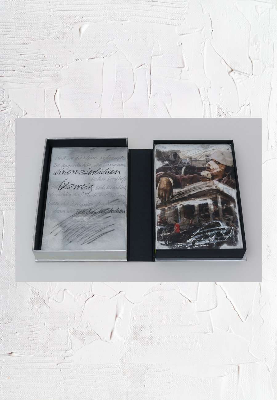 Linol- und Papierschnitt, aber auch mit Schattenbild-Theater und an Künstlerbüchern (z.B. Neruda, Rilke, Hölderlin und Joyce). Sie schuf - auch in meinem Sinn - keine Illustration zu dem Gedicht, sondern übertrug es kongenial in die Gegenwart des Bürgerkrieges in Syrien. In ihre Collagen sind auch antike Kunstwerke aus dem Nationalmuseum in Damaskus eingeflossen, z.B. das Sitzbild eines Gottes (14. - 13. Jhd. vor Chr.), der Kopf einer Beterstatuette (um 2650 vor Chr.) oder eine nackte Göttin aus der gleichen Zeit; aber auch das Gedicht "Lebensalter" (1803) von Hölderlin, beginnend mit "Ihr Städte des Euphrats! Ihr Gassen von Palmyra!" In mehreren Gesprächen zu diesem Projekt hatte ich erzählt, als junger Mann die Wüste von Baghdad nach Damaskus durchquert und Palmyra besucht zu haben. Durch das intensive Ringen mit der Thematik ist ihr ein großer Wurf gelungen. Diese Arbeit gehört zu den besten Objekten meiner Sammlung.