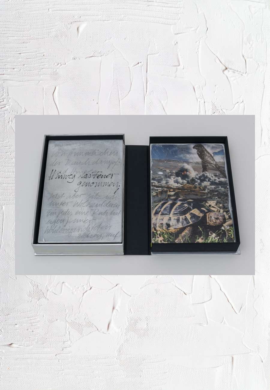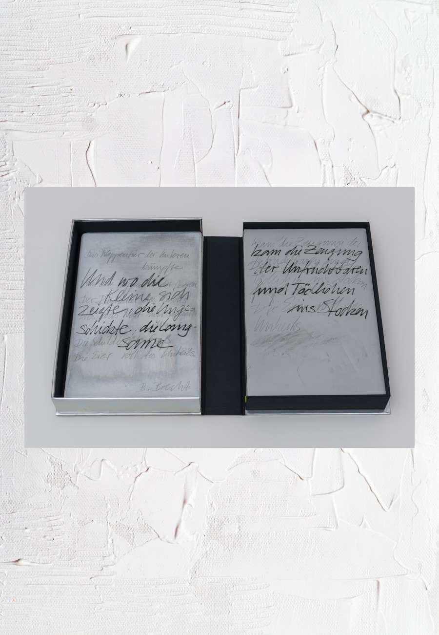 Auftragsarbeit, Künstlerbuch zu dem Gedicht "Im Zeichen der Schildkröte" von Berthold Brecht, 20 Seiten plus Titelseite, auf Aluminium-beschichteten
