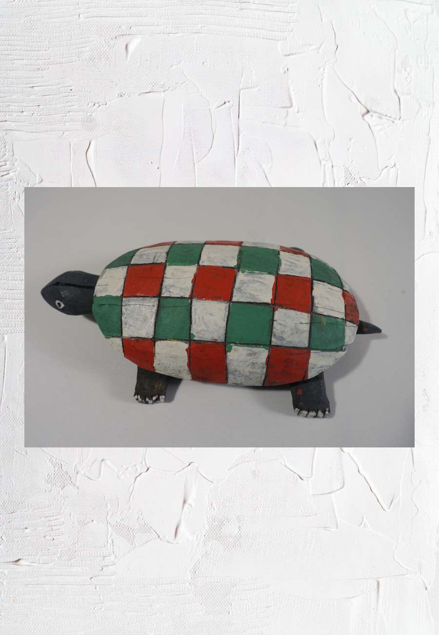 Das Objekt stammt aus der Sammlung Hölty, ist aus einem Stück geschnitzt und handbemalt, Größe 28 cm. Die Farben erinnern ein wenig an die italienische Trikolore.