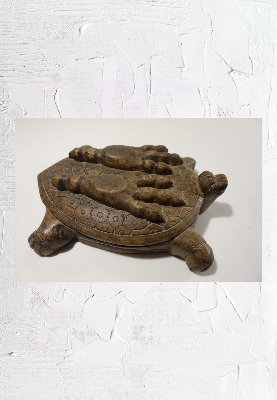 Auf dem Rücken der Schildkröte (Größe 27 cm) befinden sich zwei mächtige Vogelfüße. Dies legt nahe, dass ursprünglich ein Garuda auf ihr stand. In Urzeiten war in der