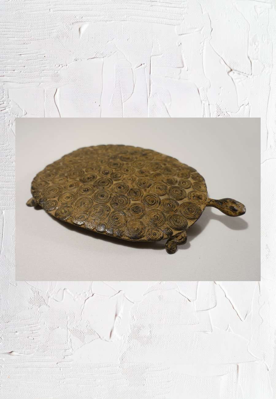 Bronze-Guss der Dogon (Mali), extrem flacher Panzer mit zahlreichen charakteristischen Kringeln und unverhältnismäßig kleinen Gliedmaßen, Länge 25 cm, Höhe 2,5 cm.