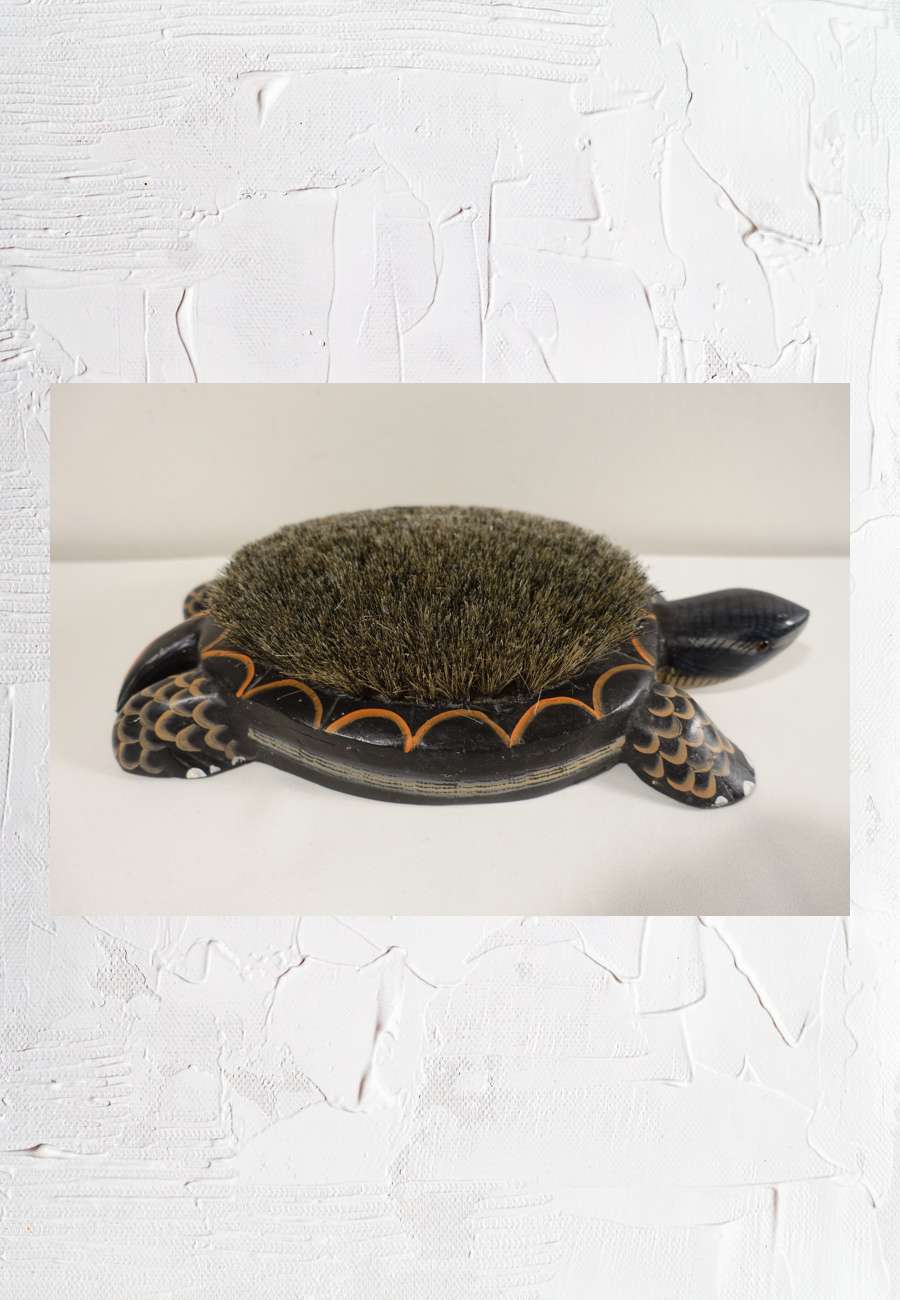 Dieses geschnitzte Objekt (Größe 50 cm) ist handbemalt, hat eingelegte Augen und auf dem Rücken dichte Borsten. Es dient als Fußabstreifer und wurde aus einer Sammlung übernommen. Der Herkunftsort ist nicht bekannt.
