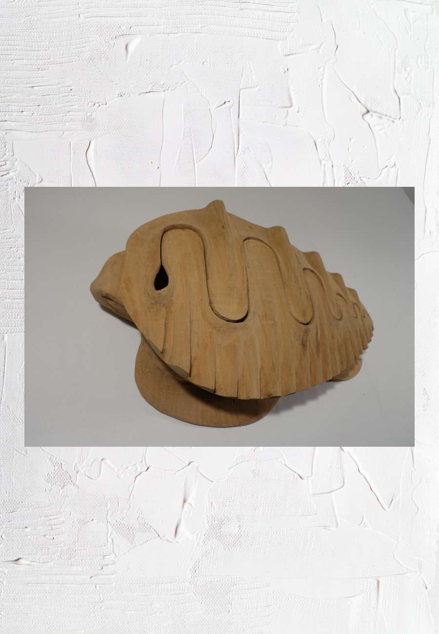ein Modell im Maßstab 1 : 2 aus Ton gebaut. Aufgabenstellung war ein hohler Klangkörper. Meine Entscheidung per Handschlag fiel auf diese Form, die der Südtiroler Schüler sehr arbeitsaufwendig in gedämpftem Birnenholz ausgeführt hat, sign., Größe 43 cm. Er gewann im gleichen Jahr den 1. Preis seiner Bildhauer-Klasse und setzte das Studium zum Meister fort.