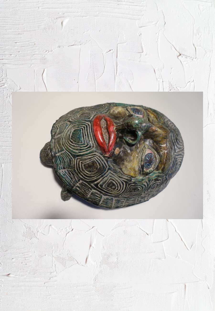 Das Unikat trägt den Titel "Zeitgeist" und bezieht sich damit auf Vereinsamung/Panzerung. Die Münchner Künstlerin absolvierte nach dem Abitur eine Lehre zur Schauwerbegestalterin und machte sich dann bald selbständig. Sie entwickelte und perfektionierte eine eigene Technik, auch für große Formate. Material sind Pappmachè und Salzteig, handbemalt, Größe
