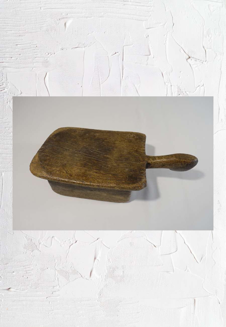 Dieser Hocker, aus einem Stück geschnitzt, gehörte einer Frau vom Stamm der Lobi und gilt als Mitgift. Der Kopf ist zugleich ein praktischer Griff. Er steht