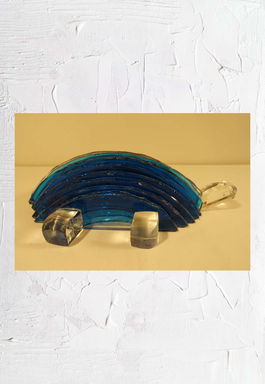Bei dieser Auftragsarbeit ergeben sich je nach Beleuchtung wechselnde Lichtbrechungen mit schönen, blau changierenden Reflexionen. Der Panzer besteht aus 14 farblosen, bogenförmigen Glasschichten (Sägeschnitte) , die sich nach oben vergrößern . Die Farbe entsteht durch hauchdünnen Klebstoff, der jeweils flächendeckend aufgetragen wird und Schicht für Schicht einzeln austrocknen muß, Signatur im Boden eingraviert, Größe 33cm. Der Künstler hat die Glasfachschule in Kaufbeuren-Neugablonz besucht, an der