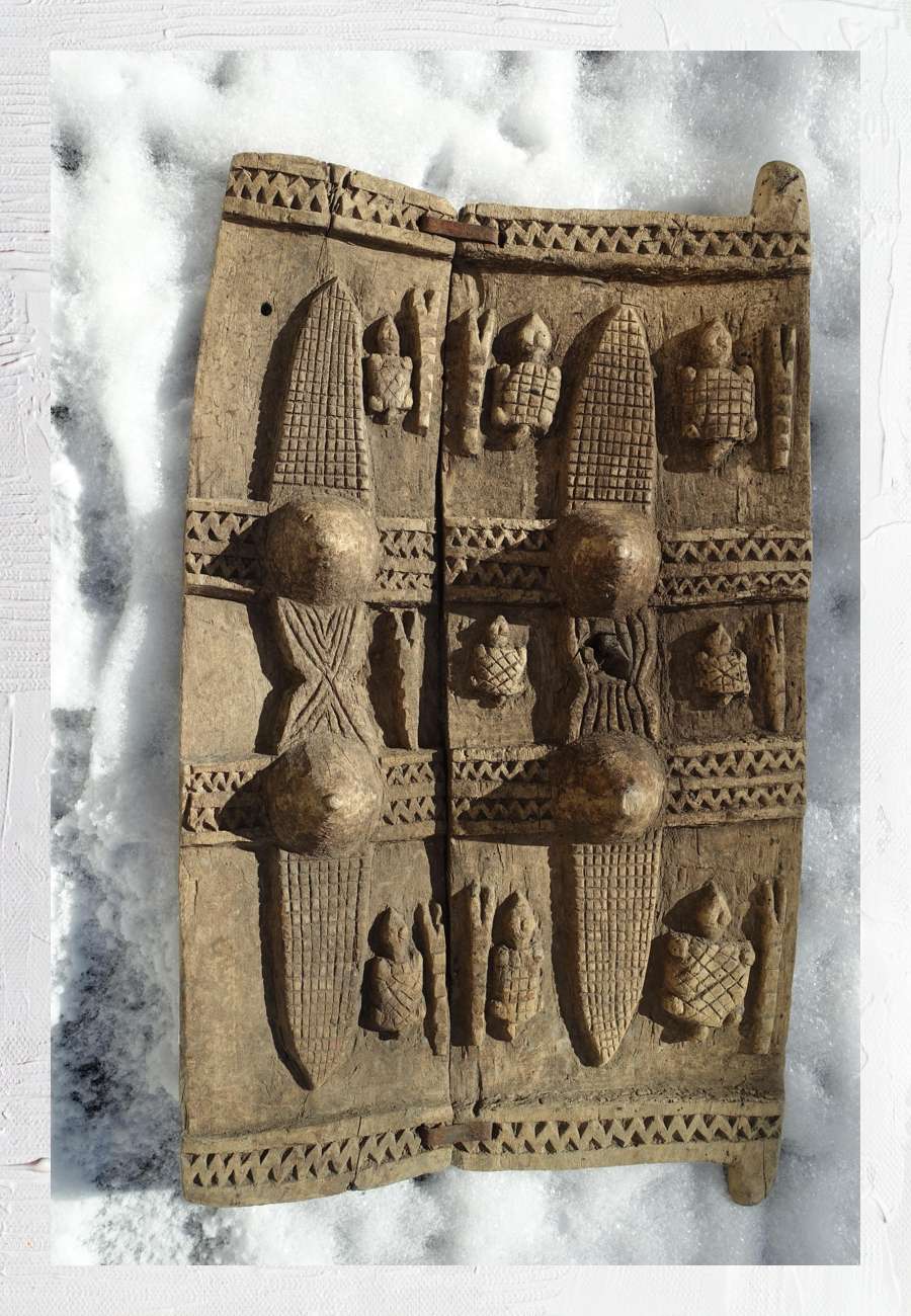Alte Kornspeicher-Tür für die Hirsebevorratung, Schnitzarbeit im charakteristischen Dogon-Stil, mit Motiven der Fruchtbarkeit (Brüste, Schildkröten) verziert. Erhalten sind auch die Zapfen zum Einsetzen der Tür, Größe 78 x 46 cm. Die Dogon sind oft hervorragende Künstler und pflegen zum Teil