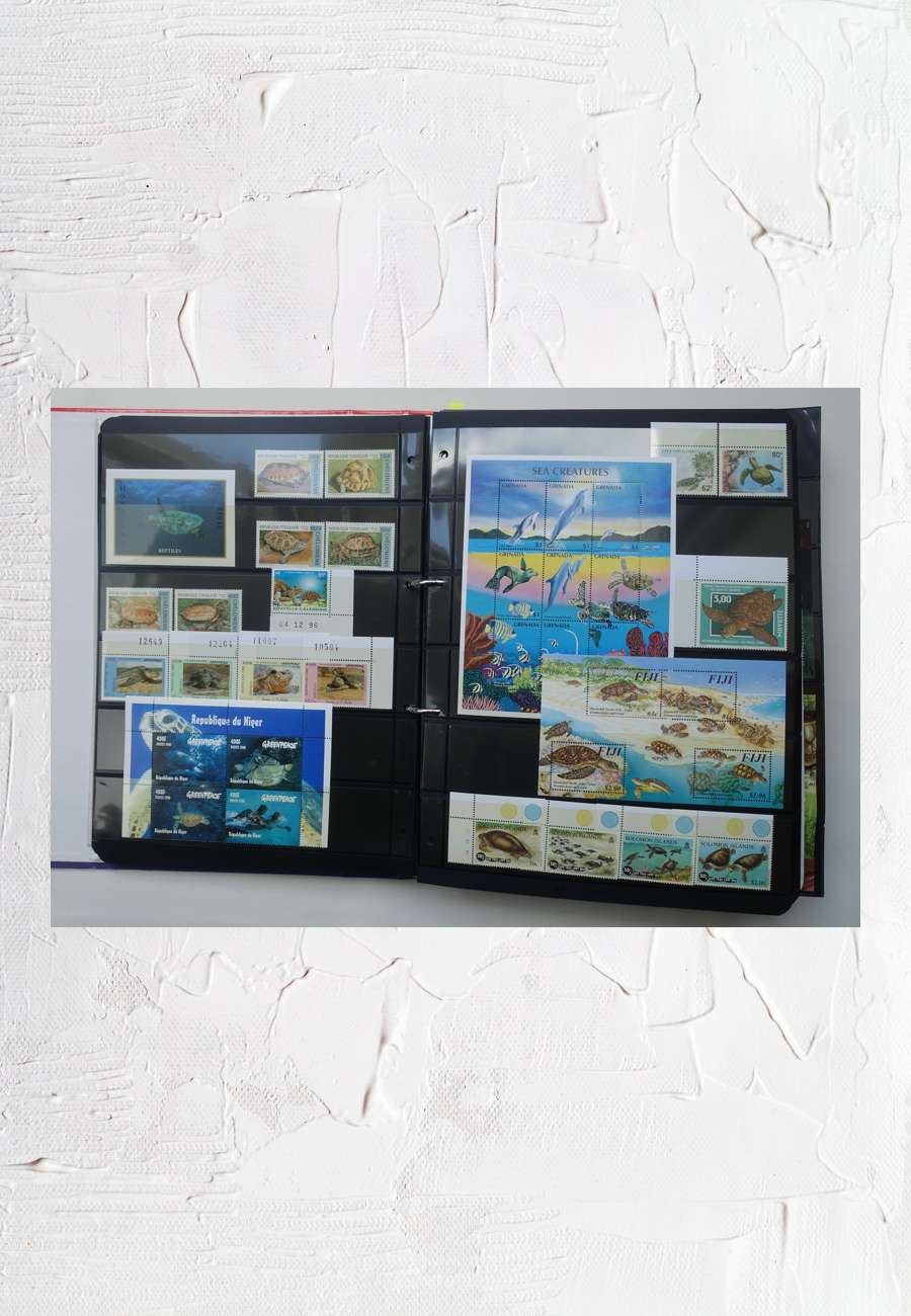 Die Briefmarken-Sammlung umfasst ausschließlich Schildkrötenmotive aus ca. 100 Ländern, hier eine Doppelseite des entsprechenden Albums. Links: Honduras, Togo, Nouvelle Caledonie, Laos und Niger. Rechts: Grenada, Wallis & Futuna, Mayotte, Fidji und Salomon Islands.