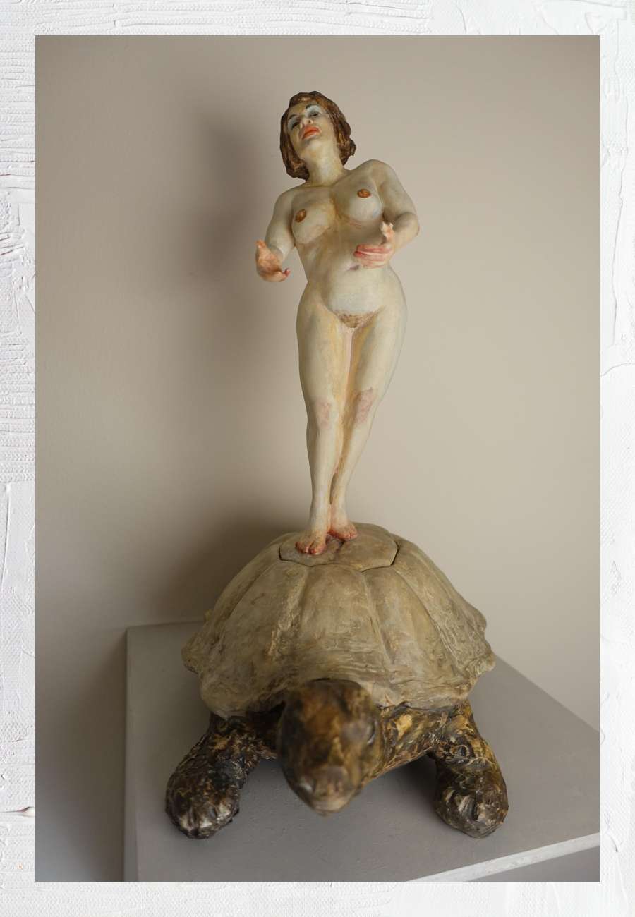 bei Prof. Günther Fruhtrunk). Er beschäftigt sich auch intensiv mit Philosophie. Zuweilen ist ein Bezug zu Mel Ramos wahrnehmbar. Seine Figuren werden zunächst zeichnerisch entwickelt, mit kaolinhaltiger Porzellanerde modelliert (aber nicht gebrannt), mit feinem Schleifpapier bearbeitet und mit Aquarellfarben einfühlsam bemalt, Größe 34 cm. Dieses Motiv gibt es auch als interessantes Ausstellungs-Plakat.