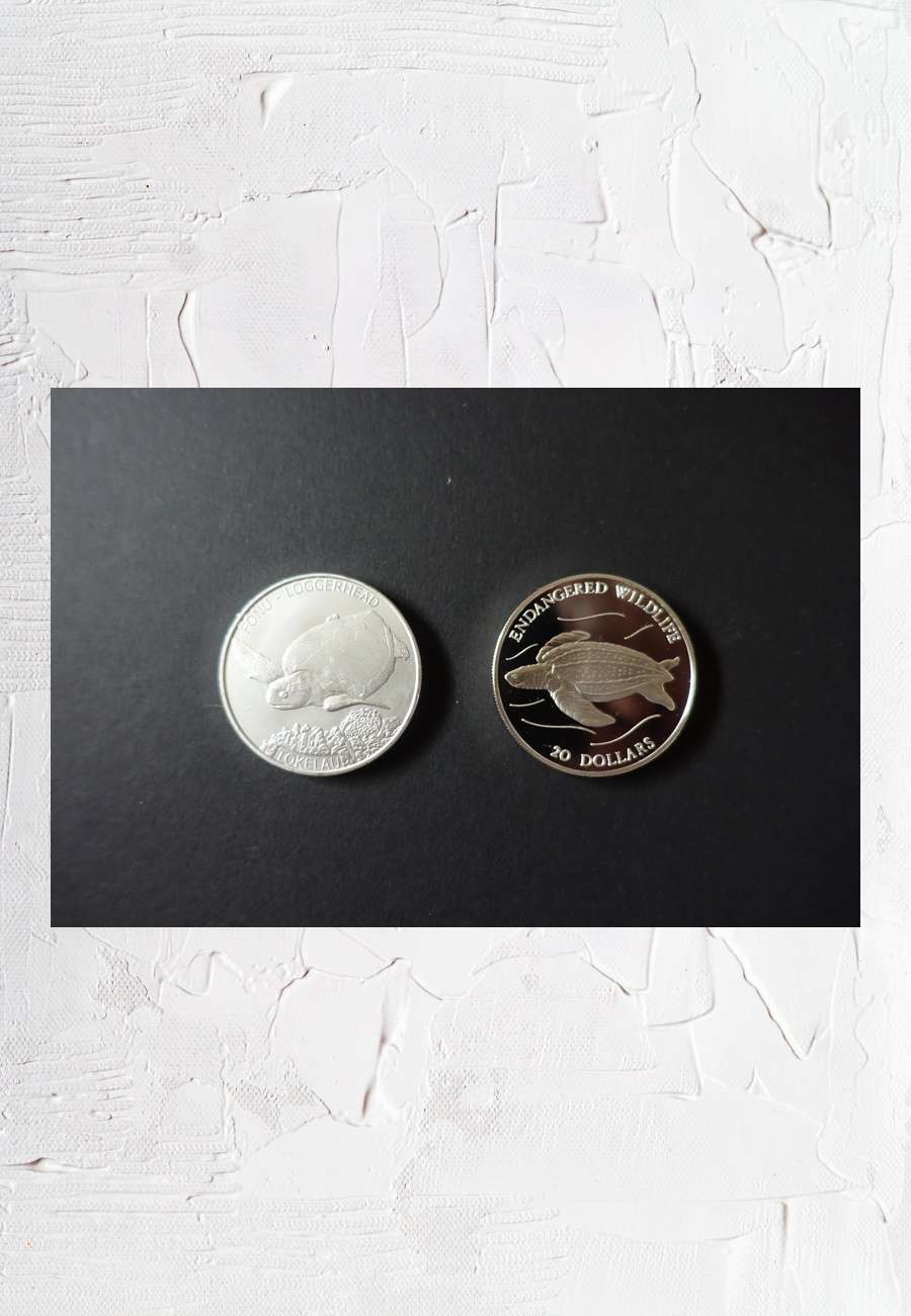 Die rechte Münze, Silber, von Tuvalu (bis 1978 Ellice Island), einem kleinen Inselstaat im Pazifischen Ozean, 1993, Durchmesser 3,9 cm, zeigt eine stark gefährtete Lederschildkröte und rückseitig ebenfalls die Queen.
