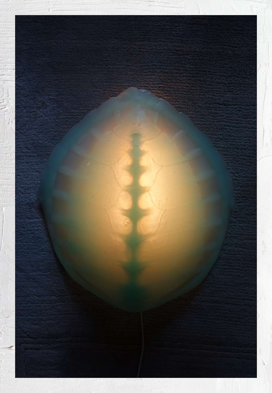 München, eine der größten naturkundlichen Forschungssammlungen der Welt *), transparent, Größe 48 cm. Einen besonderen Reiz bekommt das türkis schimmernde Objekt durch die Beleuchtung, zugleich wird das Skelett teilweise erkennbar. Ein Schwerpunkt des ausgebildeten Holzbildhauers liegt in der Lichtkunst, teilweise in Zusammenarbeit mit der Firma Osram (z.B. auf der LUMINALE 2016 oder bei "spirit of the