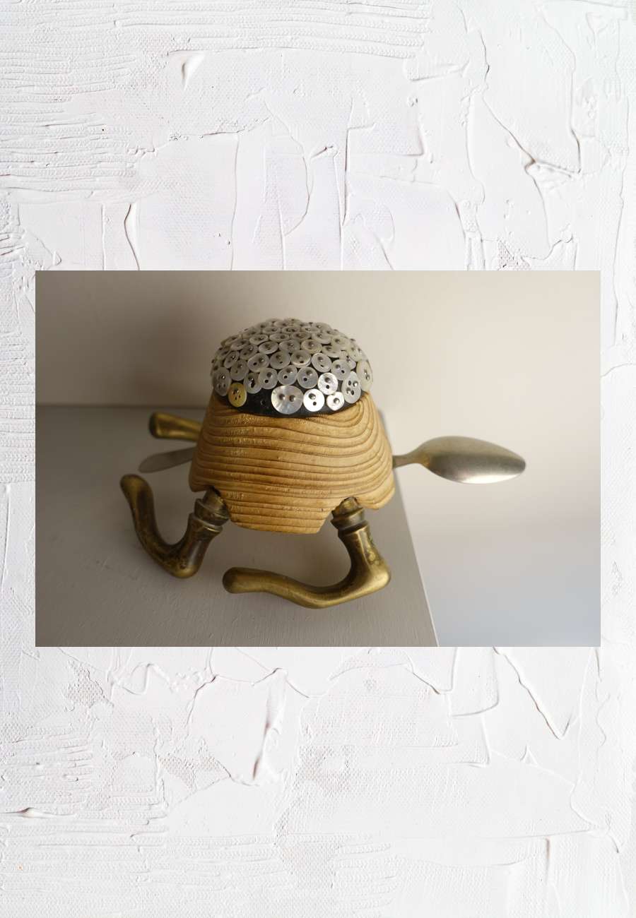 Originelle Material-Kombination aus naturbelassenem Holzpanzer, bedeckt von zahlreichen Hemdknöpfen auf Leder. Vier alte Fenstergriffe aus Messing dienen als