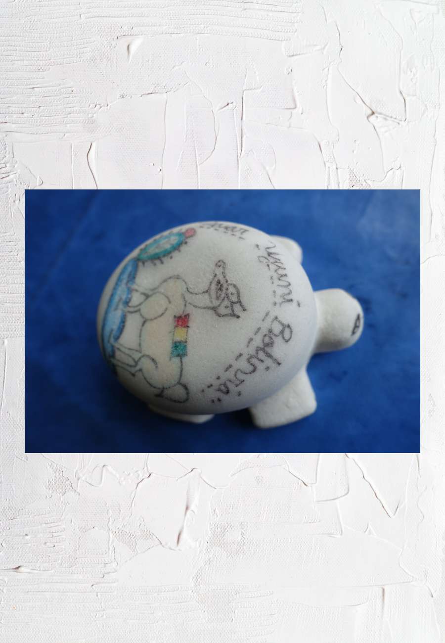 Das Döschen aus Salz, handbemalt, zeigt u.a. ein Vicunja (Lama-Art in den Anden) und ist ein Souvenir vom Uyuni-Salzsee, mitgebracht von meiner Tochter Sarah, Größe 9,5 cm.