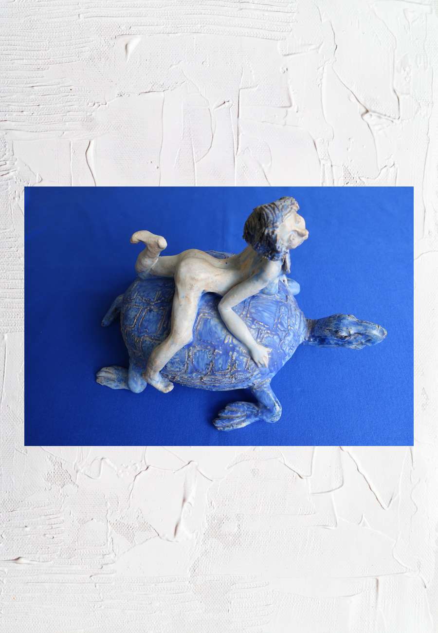 Auftragsarbeit, handgetöpfertes Unikat, sign. 2002, Größe ca. 33 cm. Die Idee, dass sich eine grazile Nackte auf einer Schildkröte räkelt, kam von der Künstlerin, die Kunstgeschichte studierte (Mag. Phil.). Eine ihrer