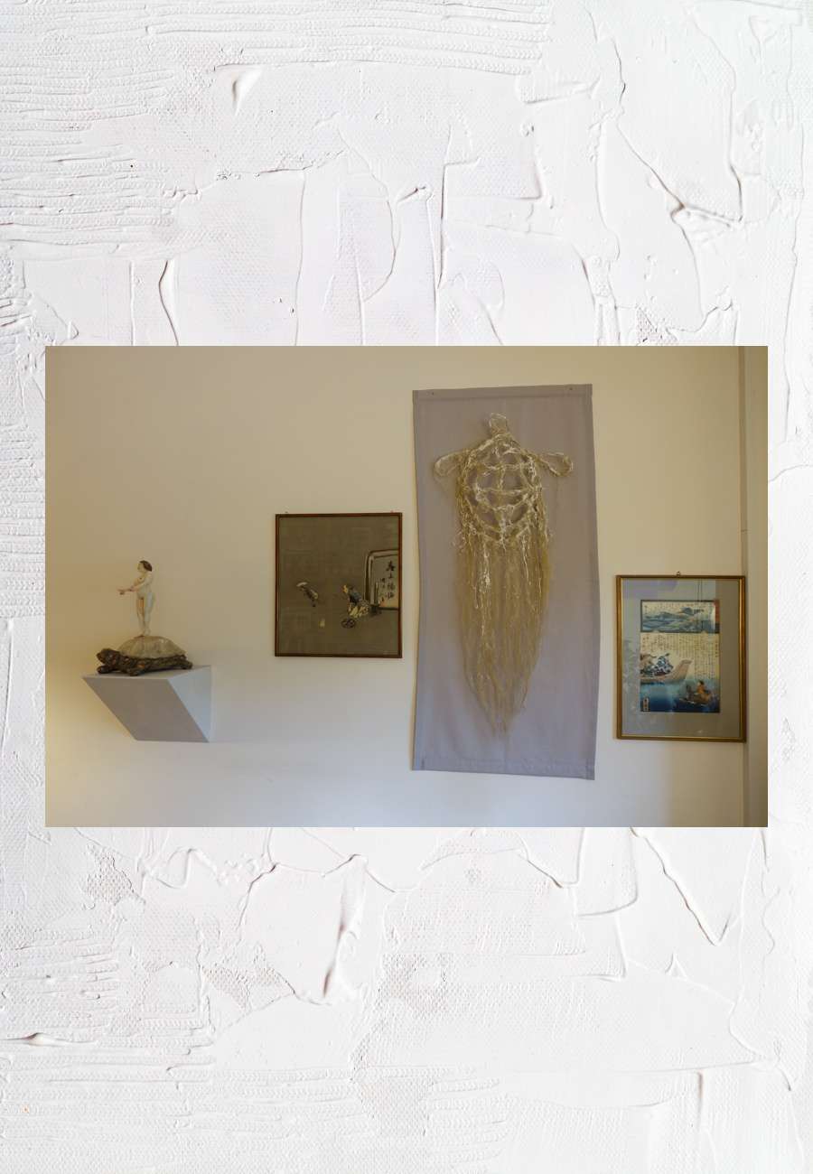 So wird das Werk (Minogame) von Annette Braune präsentiert. Es hängt zwischen zwei alten japanischen Grafiken, links die Skulptur von Bernhard Stöger.