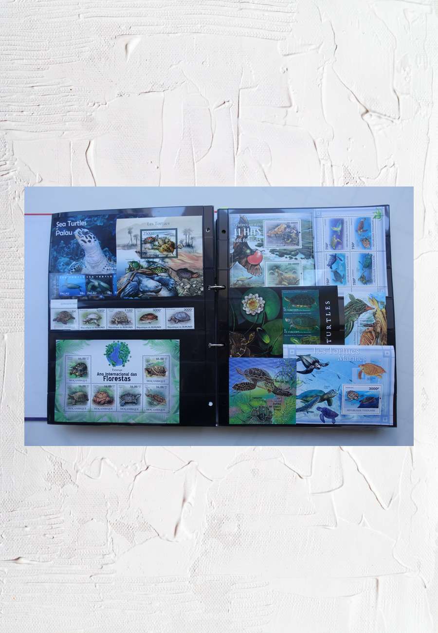 Zwei von ca. hundert Seiten meines Briefmarkenalbums zum Thema Schildkröten. Links: Palau, Comoren, Burundi und Mocambique. Rechts: S. Tomé e Principe, Togo (2 Blöcke), St. Vincent, Sahara Occidental (mit 2 prähistorischen Tieren) und Tansania.
