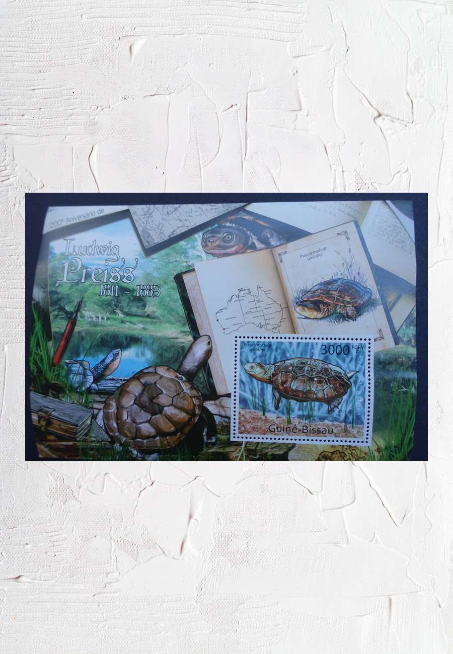 Diese Schildkröte (Trivialname: Falsche Spitzkopfschildkröte) gilt als eine der seltesten Arten der Welt, lebt semiaquatisch und kommt nur in Australien vor. Der Block stammt jedoch aus Guinea-Bissau. Das erste Tier wurde 1839 von dem Naturforscher Ludwig Preiss gefunden. Der Grafiker hat das Thema adäquat umgesetzt.