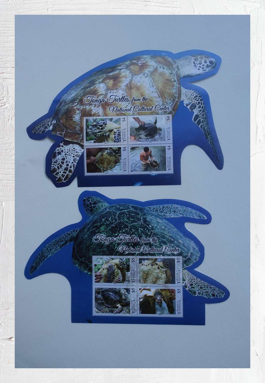 Zwei fotorealistisch gut gestaltete Blocks einer Meeresschildkröte aus Tonga (Polynesien).