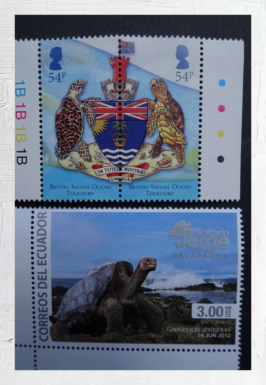 Art (die Darstellung mit Meeresbrandung ist eine Fotomontage, aber diese großen Landtiere können auch schwimmen). Er lebte seit 1973 in der Charles-Darwin-Station auf der Galapagosinsel Santa Cruz (Ecuador), wo ich ihn sehen konnte. Er starb 2012 und wurde ca. 100 Jahre alt. Obwohl alle Zuchtbemühungen vergebens waren, wurde George zu einer internationalen Symbolfigur, in New York einbalsamiert und ist 2017 in seine Heimat zurück gekehrt. Auch Mosambique hat ihm einen Block mit 6 Marken gewidmet. Die Schildkröte ist zudem Wappentier der Seychellen (Archipel vor der Ostküste Afrikas) und des Inselstaates Salomonen (Südpazifik, östlich von Neuguinea).