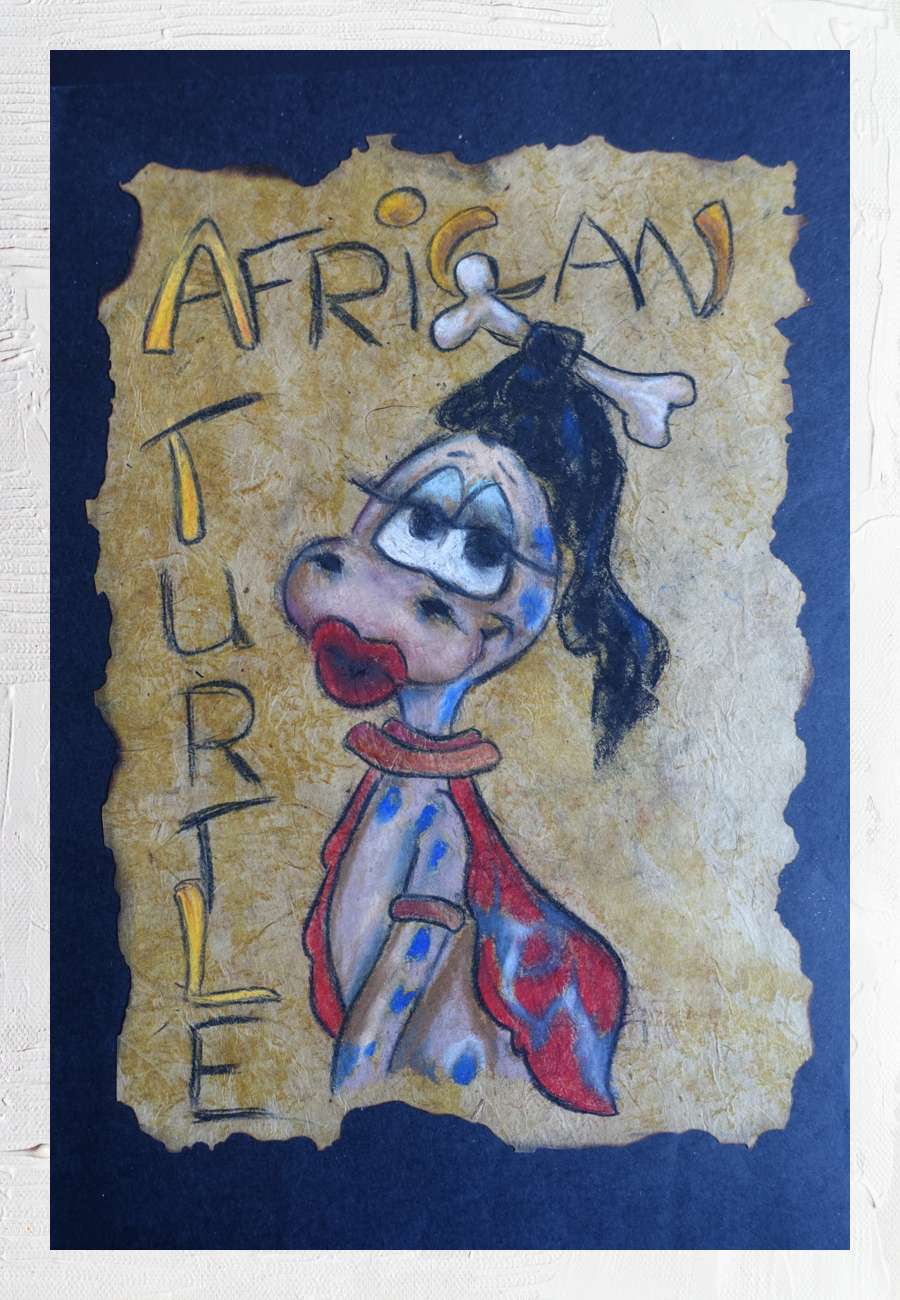 Diese "African Turtle" spielt mit Klischees, Acryl, Format 23 x 33 cm. Es gibt noch einige weitere Arbeiten in diesem Stil.