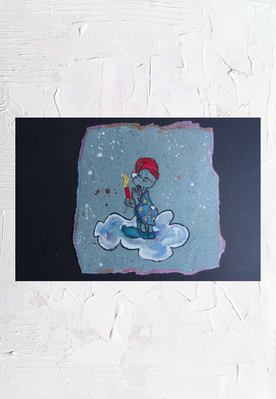 Das Motiv der Schlafmützen-Schildkröte persifliert den Deutschen Michel auf Wolke Sieben, Acryl, Format ca. 18 x 18 cm.