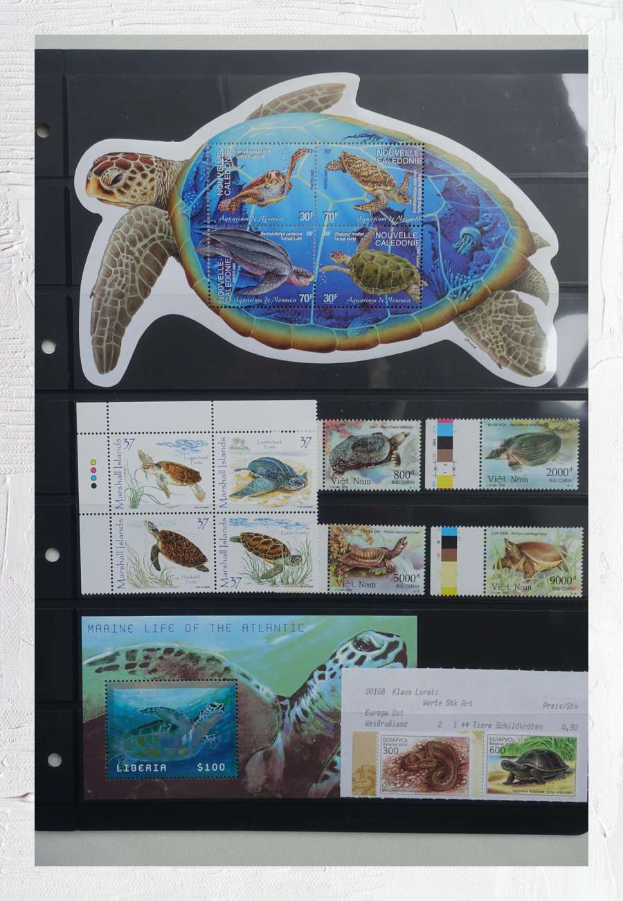Marken von Nouvelle Caledonie, Marshall Islands, Vietnam, Liberia und Belarus (Weißrussland). Vietnam zeigt vier Arten von asiatischen Weichschildkröten. Eine biologische Kuriosität: Im salzigen Meerwasser lebende Weichschildkröten geben ihren Urin unter Wasser aus dem Maul ab. Wegen ihres Fleisches geschätzt, werden sie heute überwiegend in Zuchtfarmen produziert. Männer trinken das Blut, um