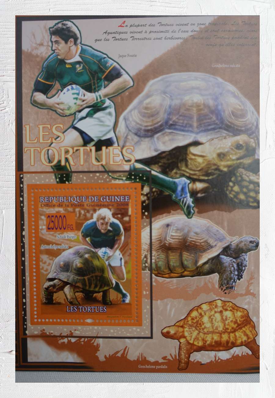 Die Idee, populäre Rugby-Spieler mit Schildkröten in Verbindung zu bringen, ist etwas überraschend. Guinea hat allein 2008 drei Blöcke dieser Art (mit insgesamt 8 Sondermarken) herausgebracht und macht damit hauptsächlich Kasse.