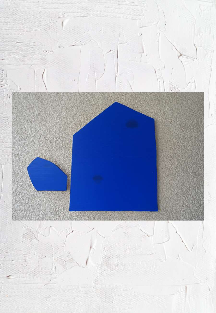 Auftragsarbeit (2007), Unikat, bei der Isolden zu einer meisterlichen Abstraktion findet, bestehend aus zwei Aluminiumplatten mit Blau-Pigment, die rückseitig von