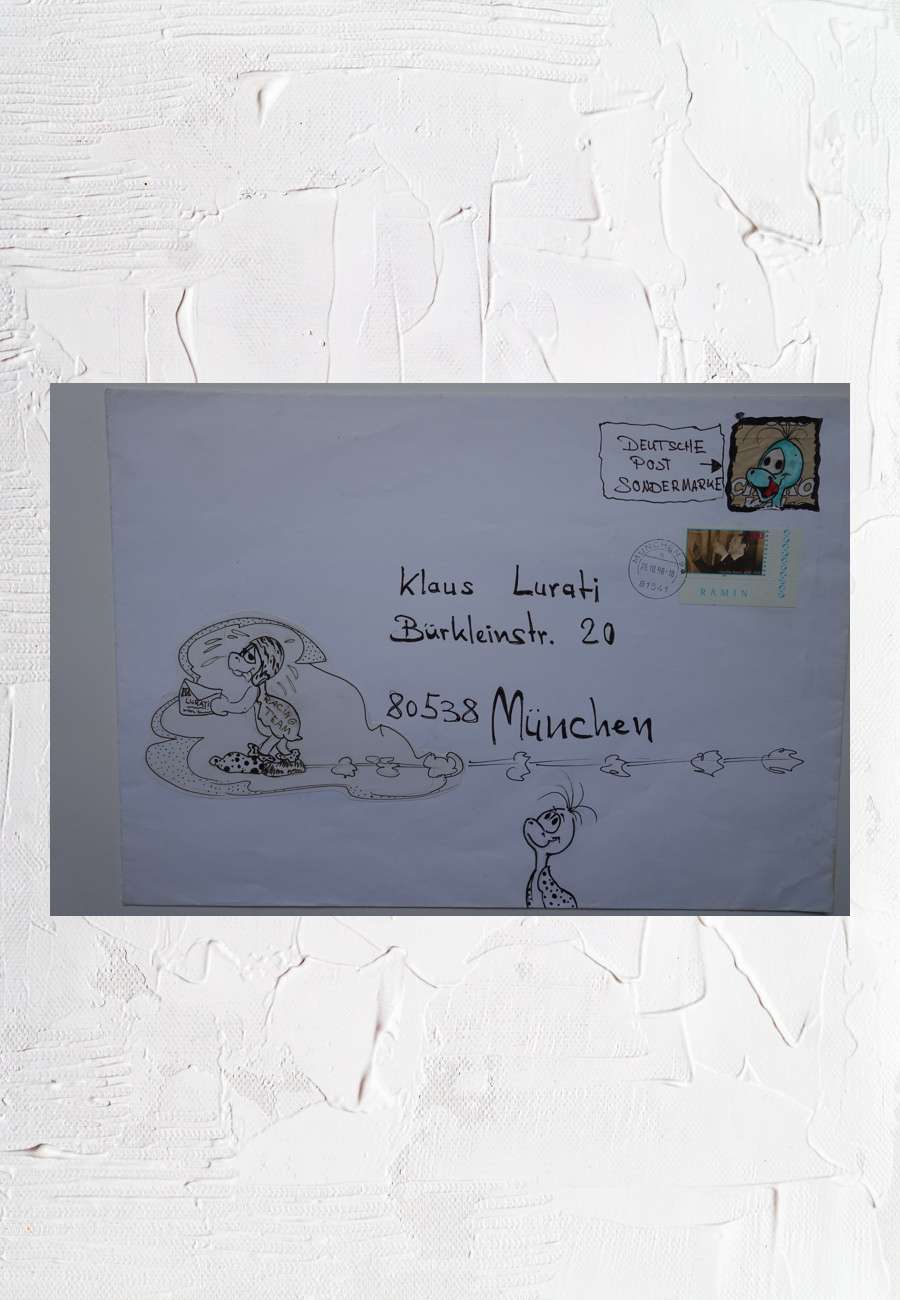 Diesen Brief mit handgemalter Sondermarke bringt mir eiligst ein Schildkröten-Postbote vom Racing Team, Format 35 x 25 cm.