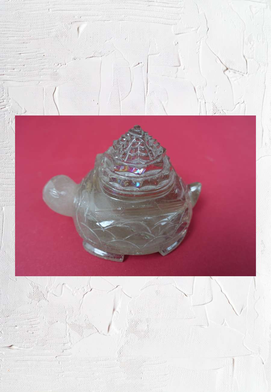 Auftragsarbeit, reiner Bergkristall (Himalaya) aus einem Stück. Die Schildkröte trägt eine Stupa (Bauwerk mit großer religiöser Bedeutung), die Krönung buddhistischer Tempelkomplexe. Grundelemente der Stupa sind : eine quadratische Grundfläche als Basis ("Erde"), ein kreisrunder Sockel, ein Kuppelgewölbe und die Spitze, die mit einer
