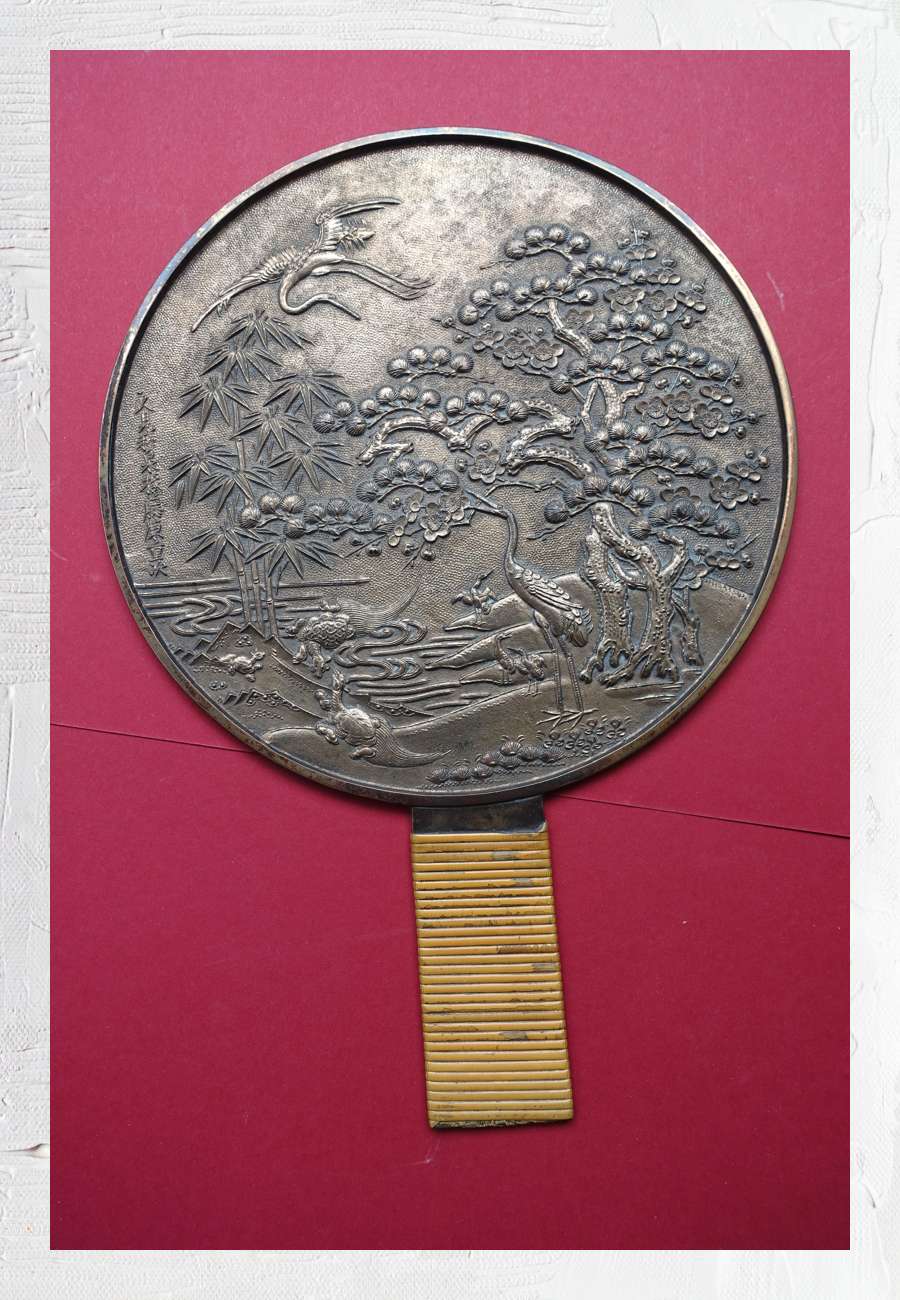 Dieser japanische Spiegel (Kagami) war ein Luxusgegenstand aus der Meiji-Zeit (um 1875), Material Bronze (Legierung aus Kupfer und Zinn), mehrfach geschmückt mit den Symbolen für ein langes Leben: Minogame, Kranich, Kiefer und Bambus. Der Künstler war ein Meister der Bronzetechnik aus Osaka, seinen Namen hat er selbstbewußt festgehalten. Der Griff ist mit Bambus umwickelt. Auf der hochpolierten Gegenseite kann man sich noch heute gut sehen. Auch die der Form des Spiegels genau angepasste Originalverpackung aus Pappmaché und der klappbare Holzständer sind original erhalten. Durchmesser 24 cm plus Griff 10 cm.