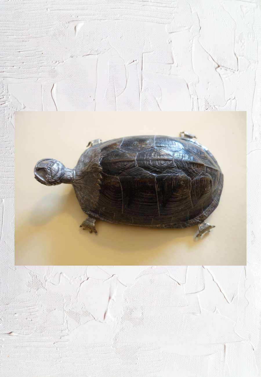 Rückenpanzer (Carapax) einer Landschildkröte mit kunstvoller Silbermontierung der Extremitäten, gefertigt in Tibet (s. auch Abbildung der Bodenplatte, "Suche : Tibet"). Der Kopf weist