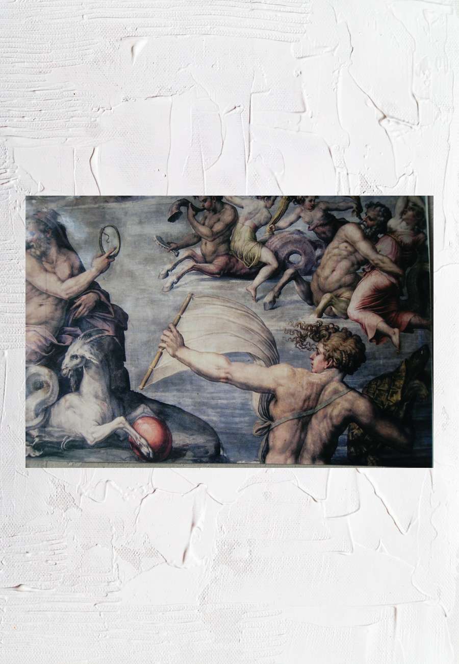 Das Foto des großartigen Renaissance-Gemäldes von Giorgio Vasari zeigt nur einen Ausschnitt (im rechten Arm eine große Meeresschildkröte, links ein Segel). Aber es diente als Vorlage für die Auftragsarbeit in Freskotechnik ("Suche : Oberdörfer & Nitsch"). Das Original ziert eine ganze Wand in der "Halle der Elemente" des Palazzo Vecchio (Florenz). Dort gibt es auch in Deckengemälden und selbst im Boden weitere Schildkröten-Motive. Der Künstler war Hofmaler, Architekt, begeisterter Kunstsammler und gilt als "Vater der Kunstgeschichte". Siehe außerdem kleine Töpferarbeiten unter "Suche : Festina lente".