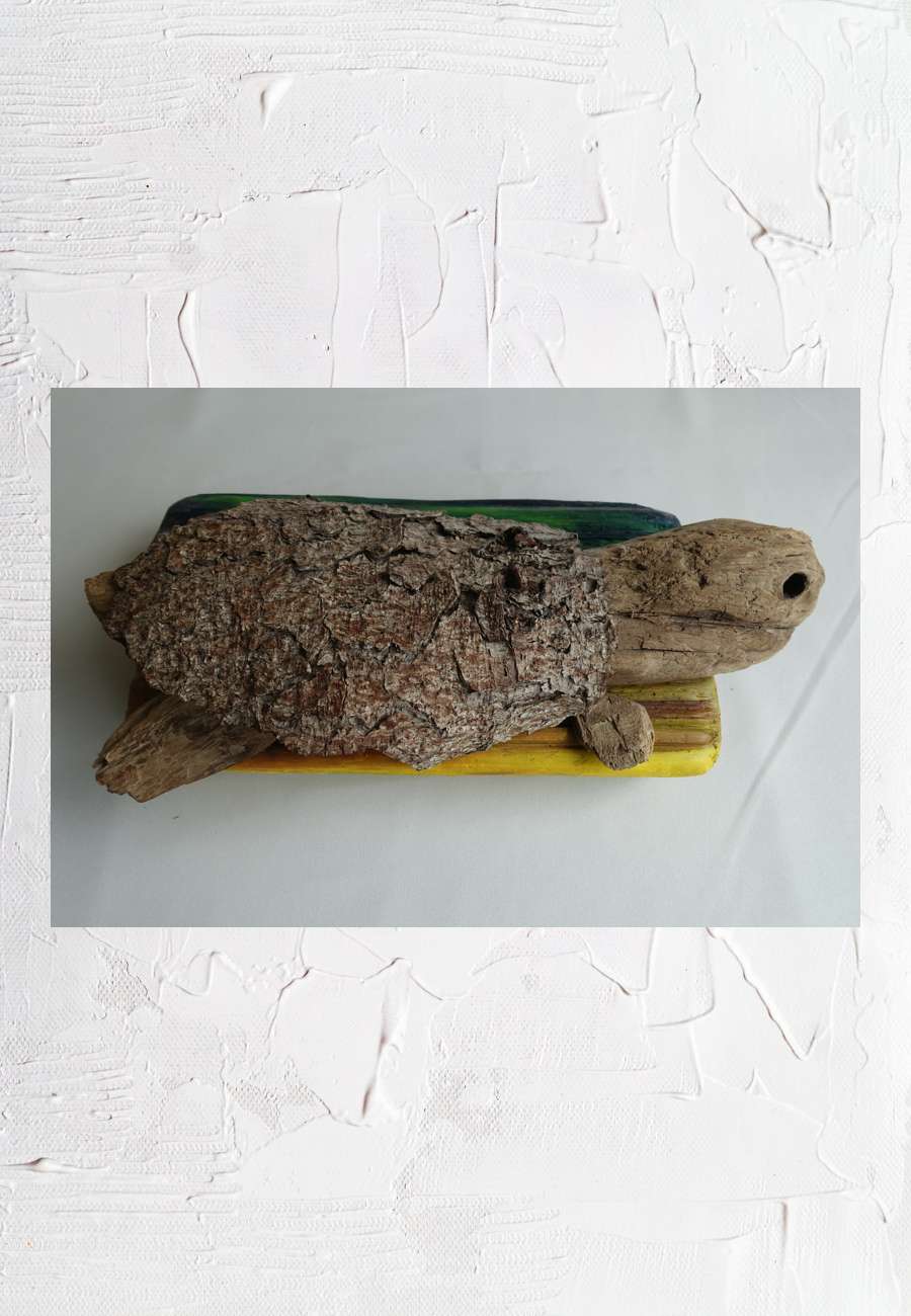 Auftragsarbeit, die Schildkröte ist aus diversen Hölzern zusammengesetzt, der Panzer aus Fichtenrinde, sign., Größe 35 cm.