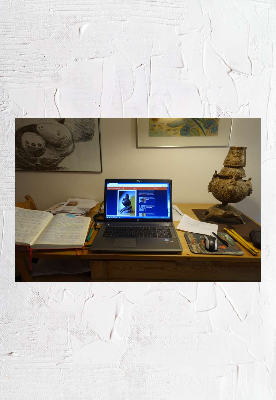 Arbeitssituation, links eine der "Kladden" (mit Notizen zu den Sammlungsstücken), rechts das gerade am PC editierte Objekt (Kultgegenstand aus Obervolta).