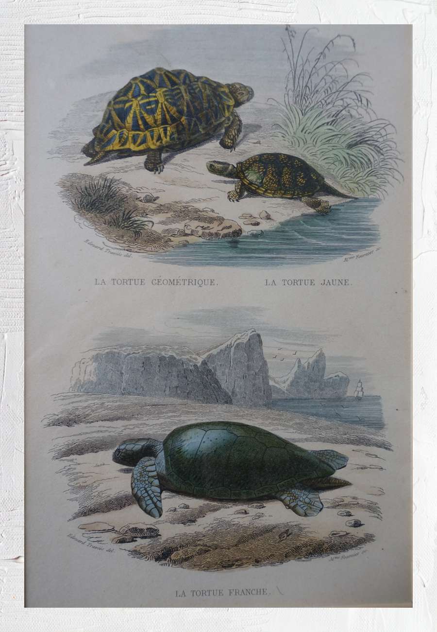 Lithografie, handcoloriert, ca. 1780 oder in einer späteren Auflage, Format mit Rahmen 26 x 35 cm. Das Blatt ist dem umfangreichen Hauptwerk von George de Buffon (und einer Reihe von Partnern) zur Geschichte der Natur entnommen. Sein Zitat von 1753 (!) "Die gesamte Oberfläche der Erde trägt heute den Eindruck der Macht des Menschen" ist angesichts der Umweltkatastrophen hochaktuell und wird deshalb in dem Buch "Das Ende der Evolution "