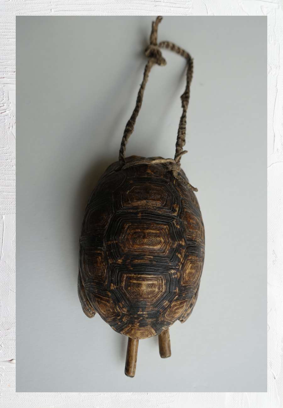 Glocke für Kamele, aus dem Süden Äthiopiens (Grenzgebiet zu Kenia), gefertigt aus dem Panzer einer afrikanischen Pantherschildkröte (Größe 13 cm), mit 2 Klöppeln aus Holzstäbchen und einem handgeflochtenem Lederband. Solche Objekte werden von Einheimischen gemacht und sind eine preiswerte Lösung (sonst sind Kamelglocken oft aus Metall). Auch in Afrika sind Bauern kreative Handwerker. Das