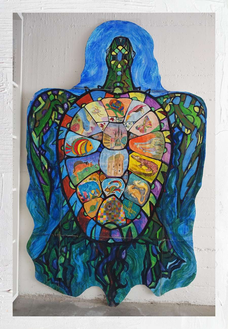 Unter der Leitung von Hans Haas entstand 2012 diese große Gemeinschaftsarbeit, Titel: "Die Urschildkröte", von 6 Mitgliedern der Malgruppe des ASZ Haidhausen. Die Inspiration zu diesem Thema kam von mir. Die Schildkröte in der